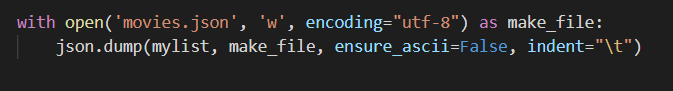 movies.json이라는 파일에 mylist에 담긴 영화 정보를 인덴트는 tab을 기준으로 해서 데이터를 넣는 느낌이다.
