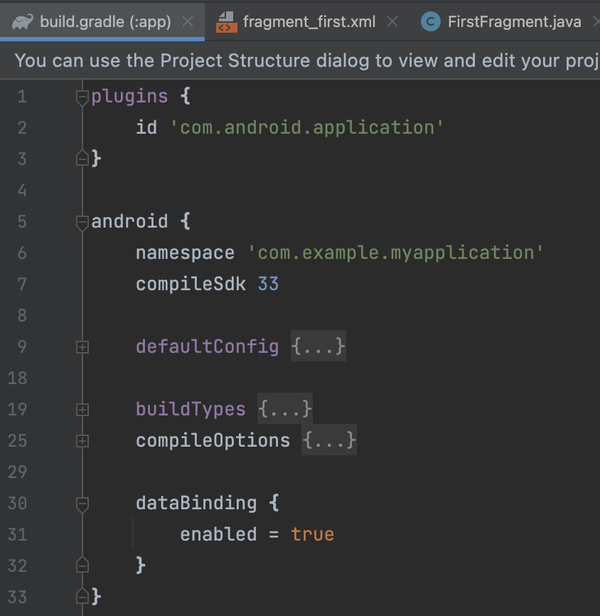 3. build.gradle (:app) 에 dataBinding 설정을 했는지 확인한다.